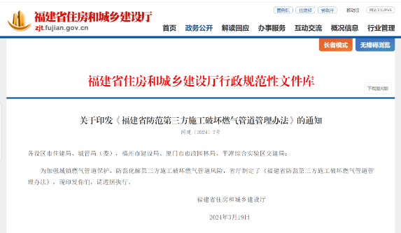 近日,福建省住房和城鄉建設廳發布關于印發《福建省防范第三方施工破壞燃氣管道管理辦法》的通知。…