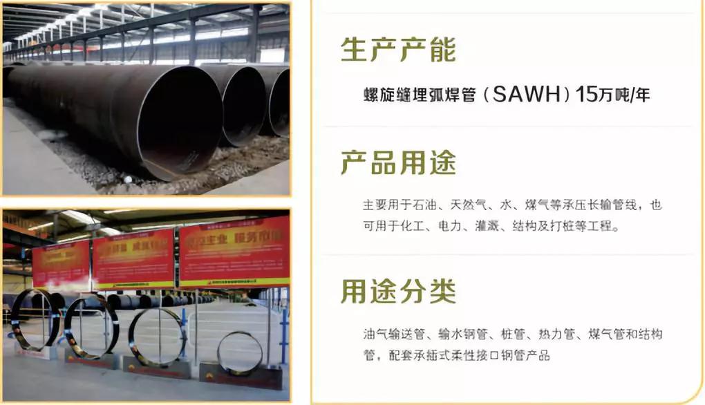 公司螺旋縫埋弧焊管制造技術能力居全國領先水平,具備目前國內螺旋縫埋弧焊管的各項先進技術,如內外焊自動跟蹤技術、雙銑邊技術、無損檢測技術、管端擴徑、靜水壓端面密封技術等。