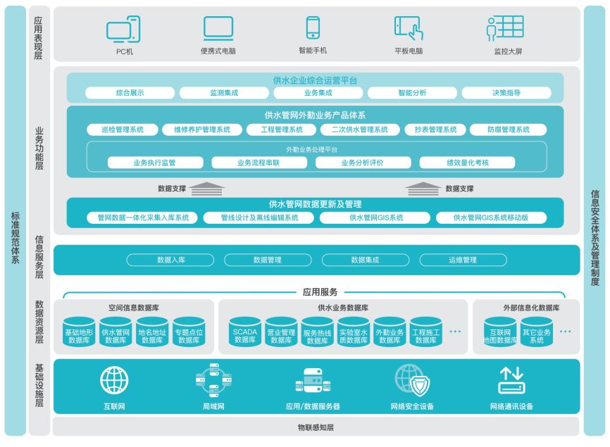 (3)物聯網技術的深度應用:對溫度、水質、氣象、視頻、壓力、流量的傳感網接入拓展了市政單位的數據獲取手段;3S和LBS技術的集成完善了動態監測和人車監管機制;動態數據融合參照及綜合分析技術強化了產品質量及服務水平保障。