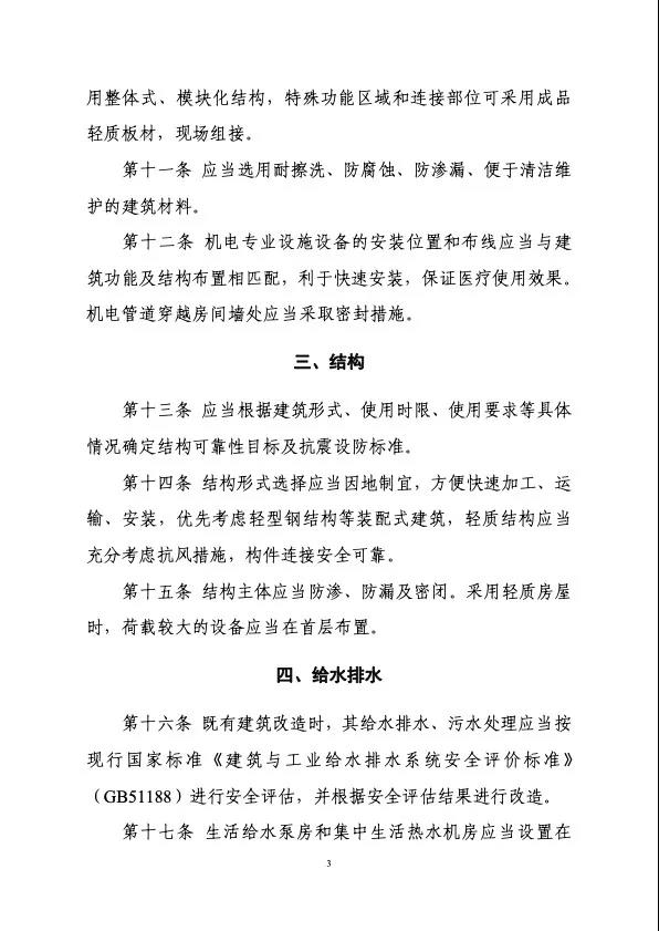 《導則》適用于集中收治新型冠狀病毒肺炎患者的醫療機構或臨時建筑的改建、擴建和新建工程項目,明確了相關工程項目的建設原則、選址、建筑設計、結構、給水排水、采暖通風及空調、電氣及智能化、醫用氣體和運行維護等多方面要求,提出了負壓病房改造參考方案,并收集匯總了醫療類建筑相關主要建設標準目錄。