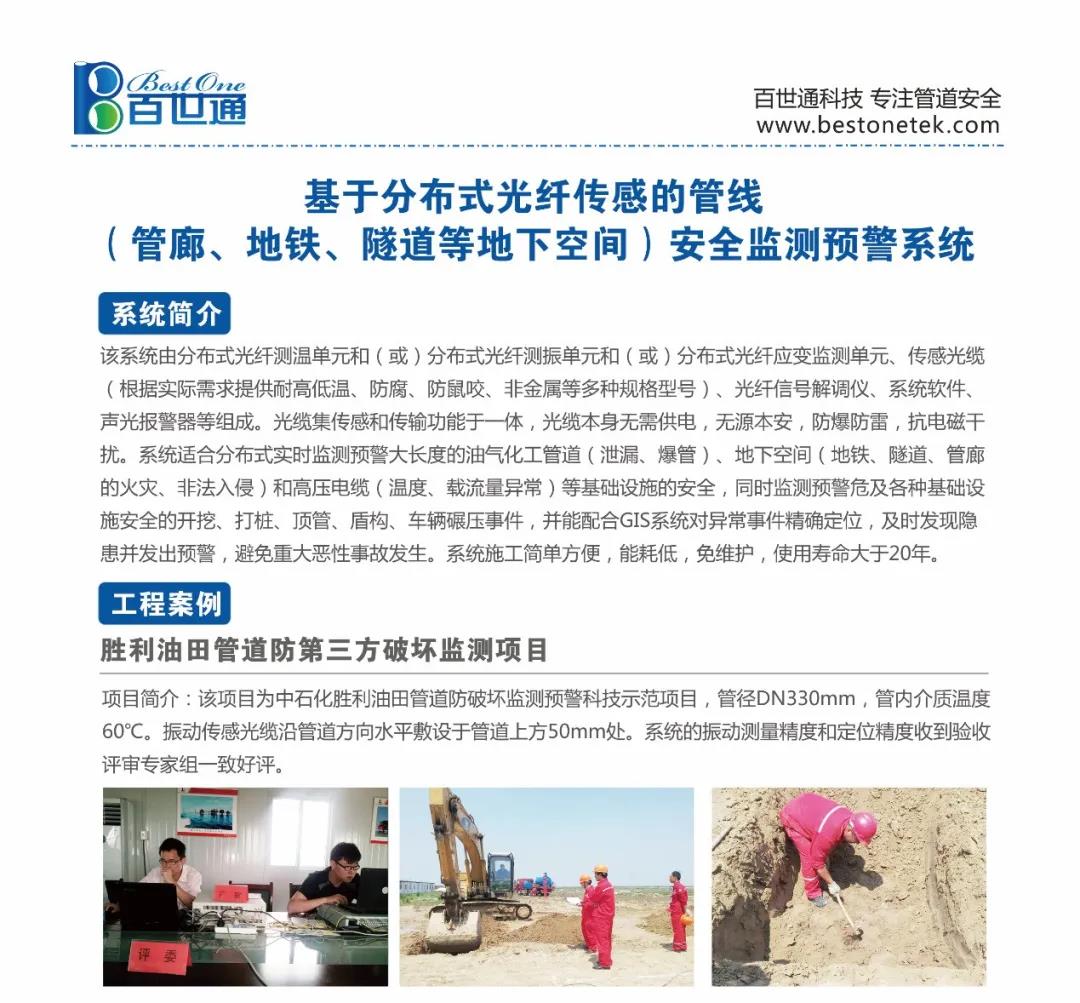 百世通擁有自主軟件著作權的“基礎設置安全健康智能綜合監測預警平臺”和18項跟管線安全相關的專利授權,致力于以埋地管道、線纜為主的基礎設施安全監測技術研究、推廣,提供安全健康監測產品和安全評估服務。針對新建管道,公司提供基于分布式光纖傳感技術的管道泄漏監測和爆管、第三方開挖破壞、地質沉降、山體滑坡預警系統;針對既有在線運行管道,公司提供基于準分布式光纖聲音偵聽技術的管道泄漏監測和爆管、開挖破壞預警系統。為了杜絕漏報,公司開發了多種技術原理和性能的光傳感產品;為了提高報警準確率降低誤報,公司開發了模式識別算法軟件;為了給客戶提供專業建議,公司正在組建專家庫和專家會診系統。