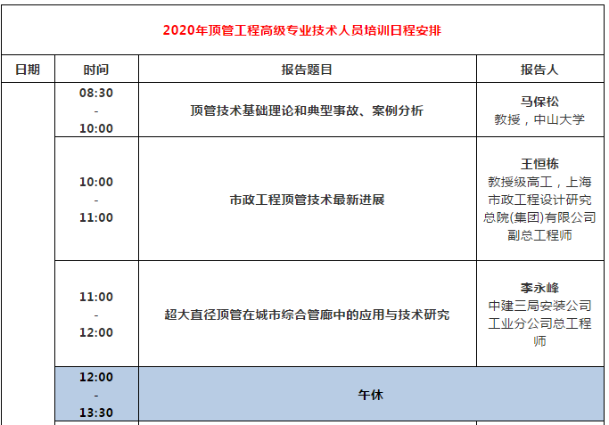 頂管工程高級(jí)專業(yè)技術(shù)人員培訓(xùn)日程安排