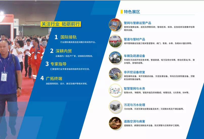 將全面展示管網(wǎng)建設、管網(wǎng)運行、智慧水務、污水污泥處理、管道材料、地下空間、在線運行監(jiān)測、管網(wǎng)探測檢測、非開挖修復、微型非開挖掘進設備、新型市政機械設備、道路空洞與病害等行業(yè)領域最先進產(chǎn)品和技術(shù),詮釋了行業(yè)的實力和魅力,吸引眾多業(yè)內(nèi)人士的關(guān)注,助力管網(wǎng)行業(yè)的高速發(fā)展。