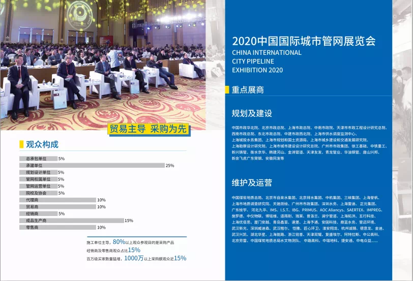 中國國際城市管網(wǎng)展是管網(wǎng)行業(yè)內(nèi)重要的盛事,目前已成為未來城市管網(wǎng)的創(chuàng)新平臺。第七屆將繼續(xù)在2020年11月25-27日,于國家會展中心(上海)舉辦。展示面積將超過35000平米,屆時將吸引展商600余家,專業(yè)觀眾30000多人次。展會同期將開展40余場高峰論壇、參會代表和新品發(fā)布會議,參會代表4000余人。