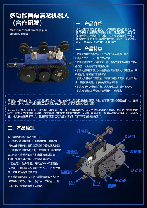 哈爾濱排水集團自主研發的管道液壓清淤機器人作為省內首個排水智慧管理系統,開啟了排水檢測數字化、智能化的新時代,填補了黑龍江省在排水科技高級智能運維零的突破。可以有效避免作業人員井下作業中毒傷亡事故,降低人工費用,提高清淤效率。