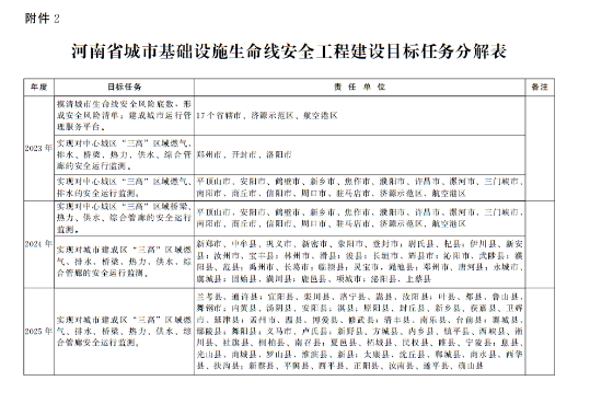 1.2023年年底前,摸清城市生命線安全風險底數,形成安全風險清單;建成省、市級城市運行管理服務平臺;鄭州市、開封市、洛陽市實現對中心城區“三高”(高風險、高敏感、高后果)區域燃氣、排水、橋梁、熱力、供水、綜合管廊的安全運行監測,其他省轄市、濟源示范區、航空港區實現對中心城區“三高”區域燃氣、排水的安全運行監測。
