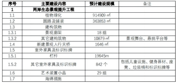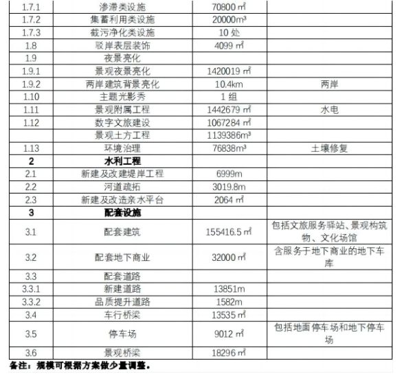 1、兩岸生態景觀提升工程:兩岸生態景觀帶中的園路及鋪裝、植物綠化、建構筑物、新建景觀人行天橋、室外家具及標識標牌、藝術裝置小品、海綿措施、駁岸表層裝飾、夜景亮化、主題光影秀、景觀附屬工程、數字文旅建設、環境治理等;