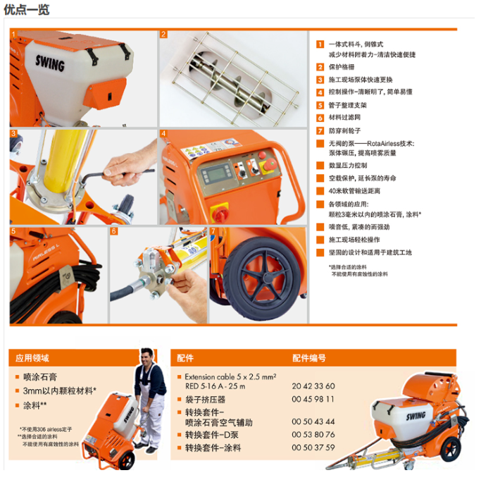 強大的230V石膏噴涂混合泵,來自德國培福德,輸送距離可達20米;一個人可以操作的石膏噴涂混合泵,230V交流電搭配SD 6-3,可噴涂和應用顆粒3毫米以內的多種材料。