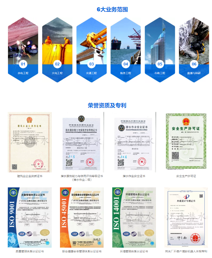 公司秉承“做有良心的水下工程”的宗旨,致力于為客戶提供高效、優質、專業、及時的服務。十幾年來,公司業務遍布國內外,積累了豐富的水下工程施工經驗,在電廠、航運、水利、港務、橋梁、市政領域完成水下工程任務,均得到施工單位部門的高度認可和一致好評。