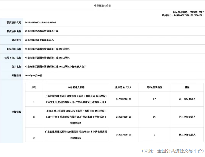 第一中標候選人:上海市城市建設設計研究總院(集團)有限公司,聯合單位:【中交上海航道局有限公司,廣東科啟建筑工程有限公司】,投標總價:247663216元;