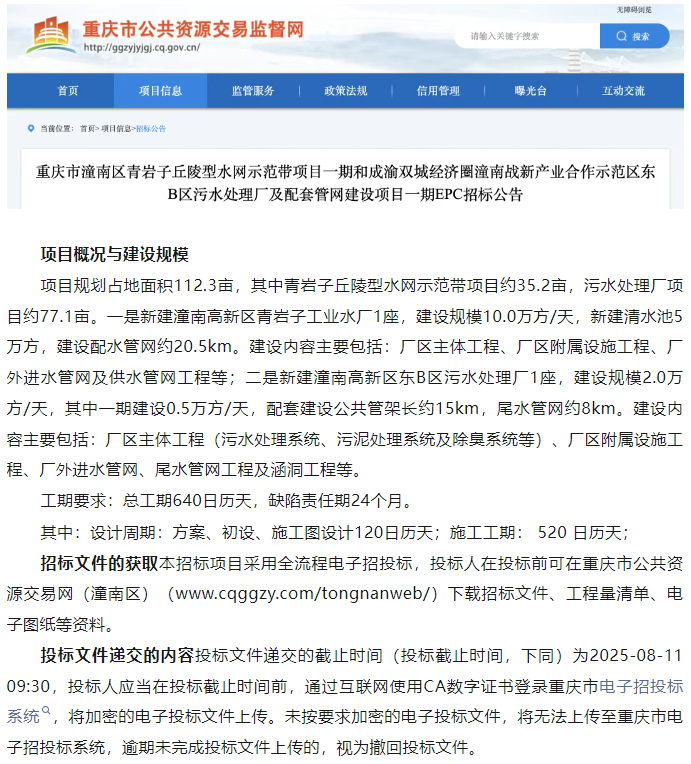 近日,中國水網(wǎng)從E20環(huán)境平臺標(biāo)訊采集系統(tǒng)E標(biāo)通獲悉,重慶市潼南區(qū)青巖子丘陵型水網(wǎng)示范帶項目一期和成渝雙城經(jīng)濟圈潼南戰(zhàn)新產(chǎn)業(yè)合作示范區(qū)東B區(qū)污水處理廠及配套管網(wǎng)建設(shè)項目一期EPC發(fā)布招標(biāo)公告,項目工程總投資額為65700萬元。