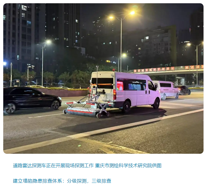 近日,在重慶市兩江新區空港東路,重慶市測繪科學技術研究院技術人員通過高精度雷達技術,精準發現了6處位于地下1米左右的塌陷隱患。技術人員立即將隱患情況通報至相關部門,為道路安全管理爭取了關鍵預警時間。這一案例,正是該院道路塌陷隱患智慧管控應用實戰成效的生動體現。